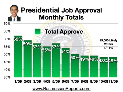 Also in November, the president's total approval remained stable at 48%. His total disapproval gained a point to 52%.